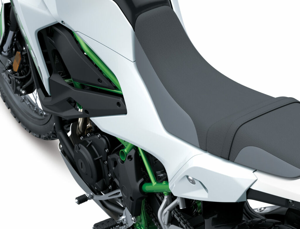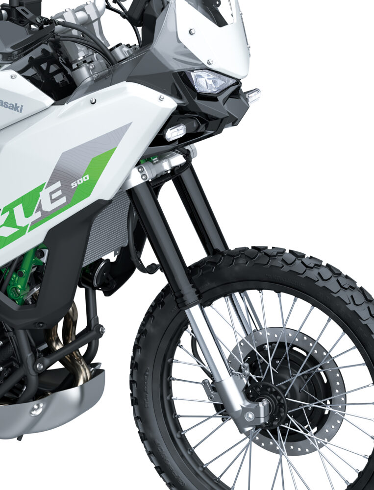 Met een 21-inch voorwiel en 17-inch achterwiel ademt de KLE500 pure off-roadstijl, terwijl het tweedelige zadel en bodywork met invloeden van de legendarische KX-modellen zorgen voor maximale bewegingsvrijheid. Voor nog meer flexibiliteit kan het zadel met een optionele ERGO-FIT duozit worden omgevormd tot één vlak geheel.