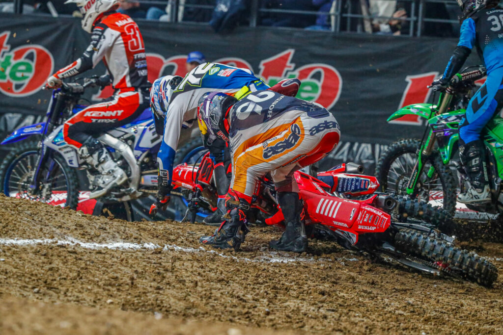Jett ging eerst onderuit in de Superpole. In race 1 verging het hem niet beter. Tom Vialle ging in de de eerste finale in de fout en nam zo beide Lawrence mee in zijn val. Malcolm ‘Mookie’ Stewart reed vlot naar zijn eerste zege van de avond voor Cooper Webb en thuisrijder Cedric Soubeyras. Hunter Lawrence keerde nog terug naar P4 voor Marshal Weltin.