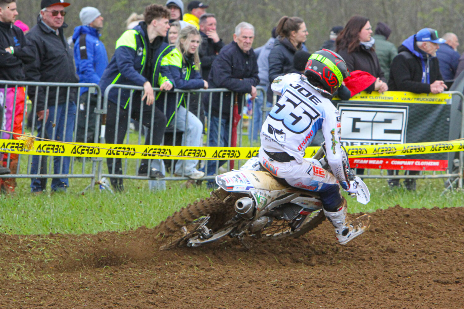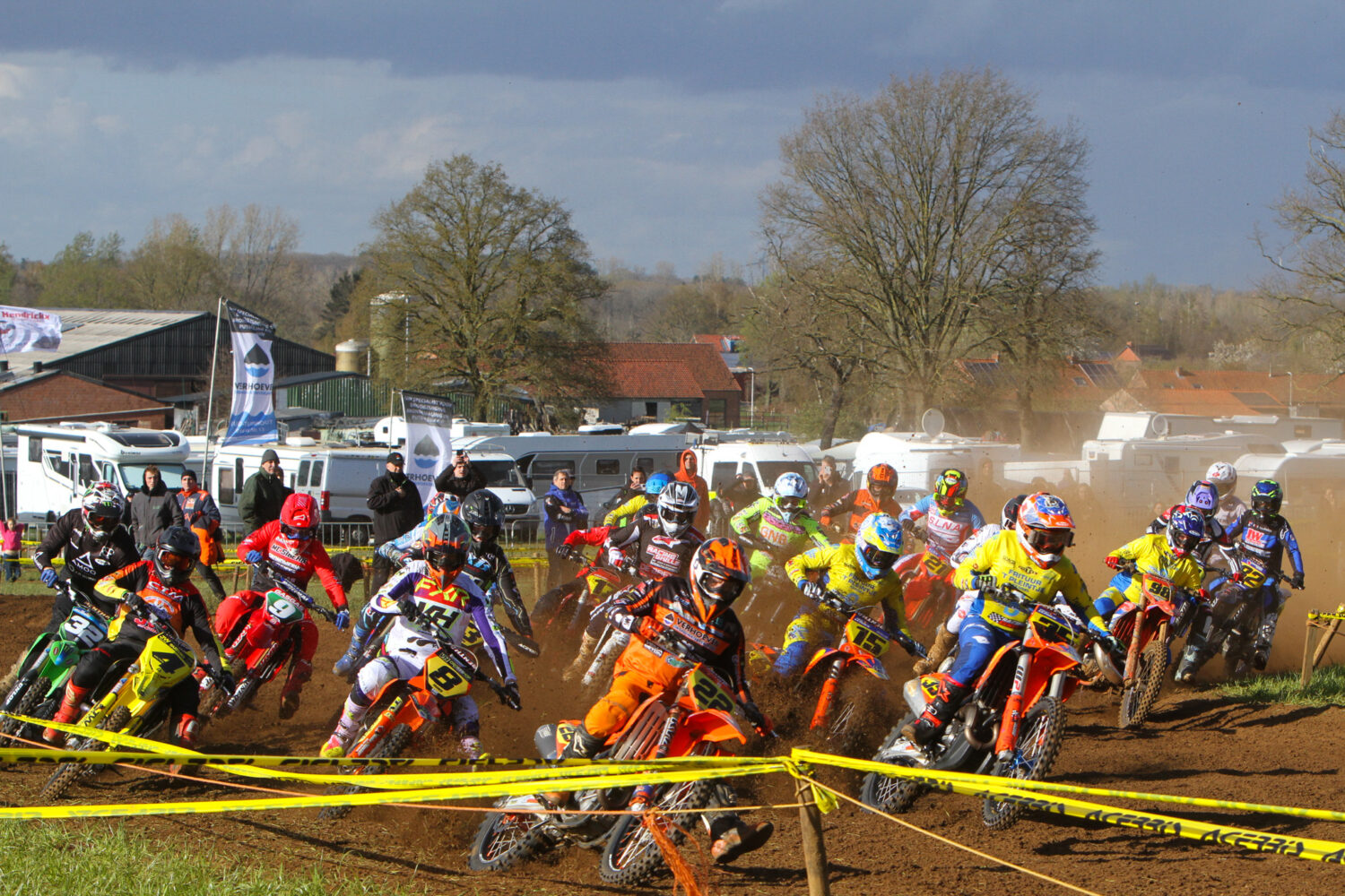 Brent Aerden nam in de openingsreeks meteen de leiding voor broer Enzo, Jamie Haanen, Tyla Van De Poel en Nolan Cordens. Maar al in de tweede ronde liep het mis: Aerden bleef met zijn voorwiel steken in een modderig spoor en werd letterlijk van zijn motor gecatapulteerd. Hij belandde tien meter verderop naast het circuit en bleef versuft liggen.