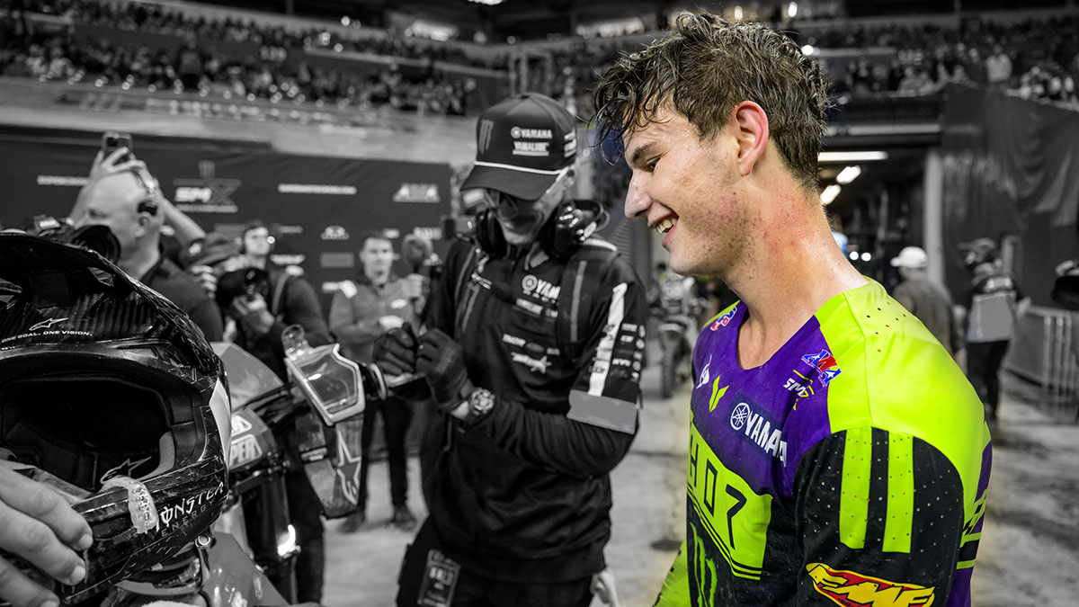 Wat een avond voor de fans! De 250SX Main Event werd ingekort door de enorme regen en de modder op het parcours, maar ondanks de inkorting kregen de fans een rode vlag en een titelstrijd met een tegenstander die tot de laatste ronde bleef tegenspartelen. Uiteindelijk was het Cole Davies die het hoofd koel hield en de kroon op zijn werk zette. Extra mooi detail: één van de vele grondleggers van dit succes, landgenoot Ben Townley, wist in 2007 al de Supercross 250 East Coast titel te veroveren—een prestatie die nu een prachtig vervolg krijgt.